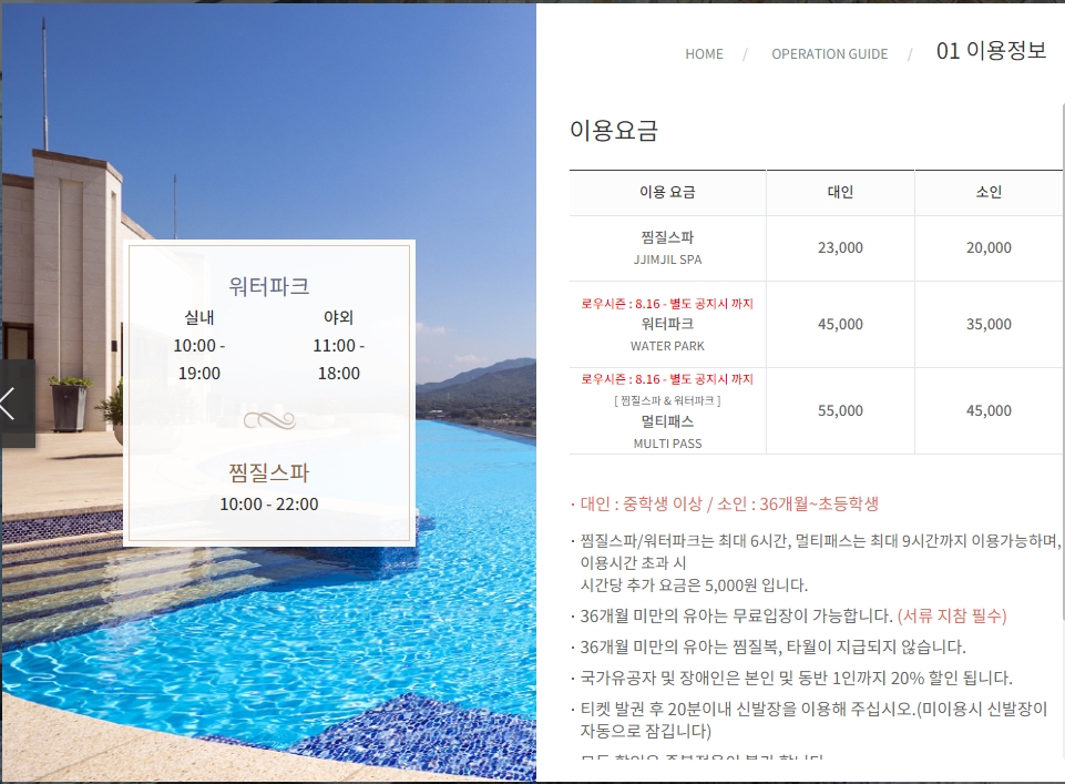 - 이용 요금: 찜질스파/워터파크 최대 6시간, 멀티패스 최대 9시간 이용 가능. 이용 시간 초과 시 시간당 5,000원 추가 요금. 36개월 미만 어린이는 서류 제출 시 무료 입장 가능