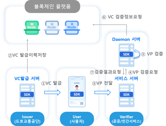블록체인 기반의 DID Decentralized Identity 기술을 적용합니다.