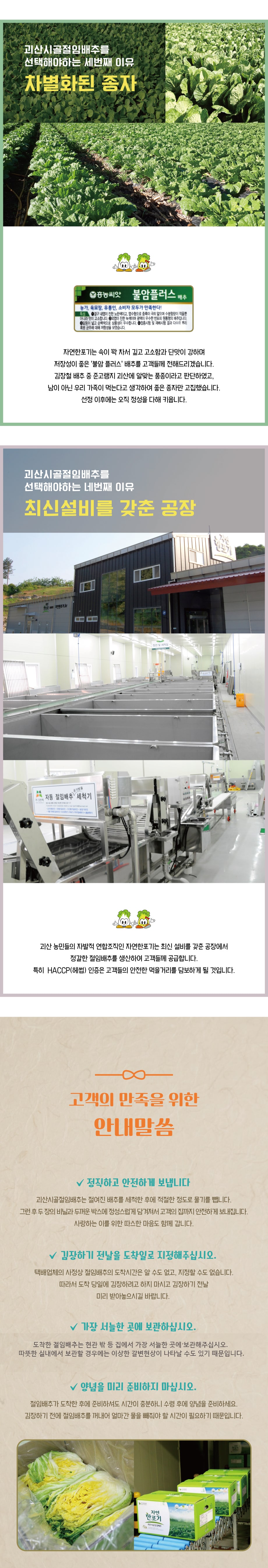 괴산 지역의 특성상 일교차가 심한 산간지방에서 재배되며, 영양 가득한 퇴비로 건강하고 아삭한 땅으로 일구어집니다. 또한, 스테비아효소를 이용한 농법으로 더욱 아삭하고 고소한 맛을 냅니다. 괴산의 맑은 물 지하암반수로 배추를 깨끗이 세척하여 맛과 품질을 보장합니다.