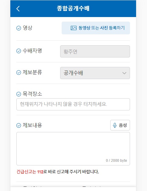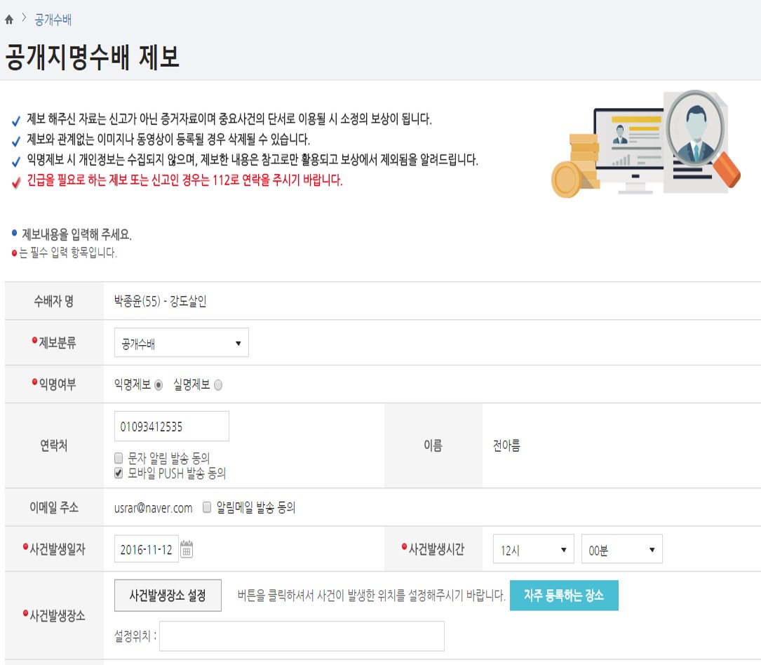 익명제보는 "사건제보"와 "공개수배" 제보에만 가능합니다.