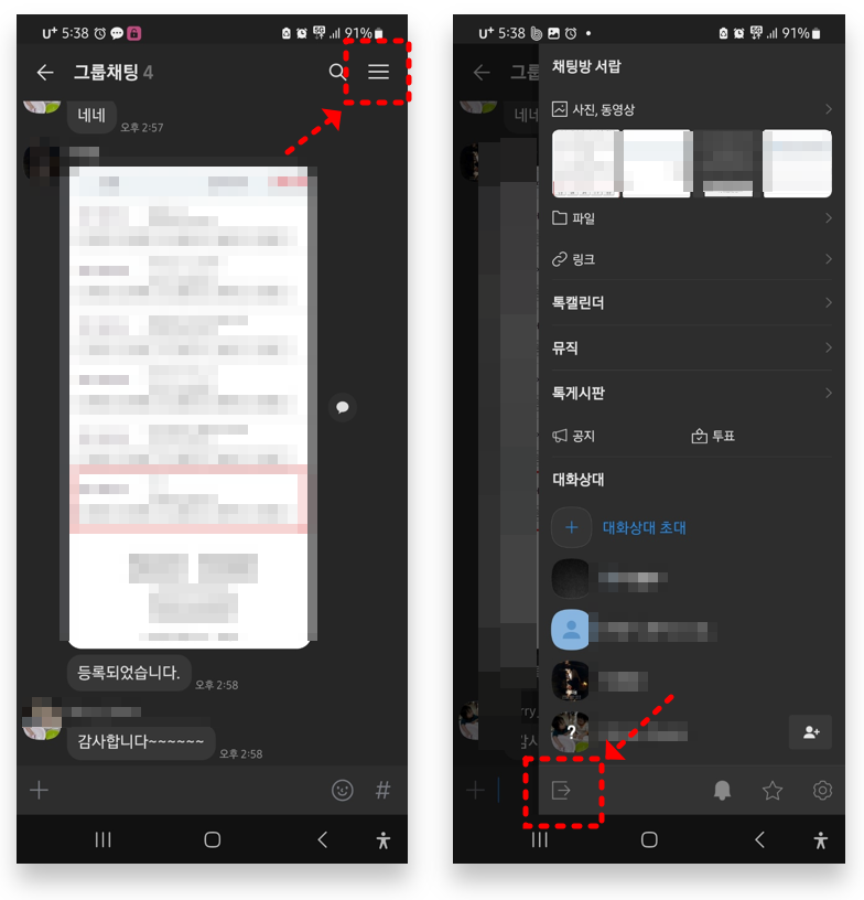 채팅방 조용히 나가기 기능은 개인이 누군가를 초대해 만든 단체방에서만 적용됩니다. 따라서 오픈 채팅방에서는 이 기능을 사용할 수 없습니다.