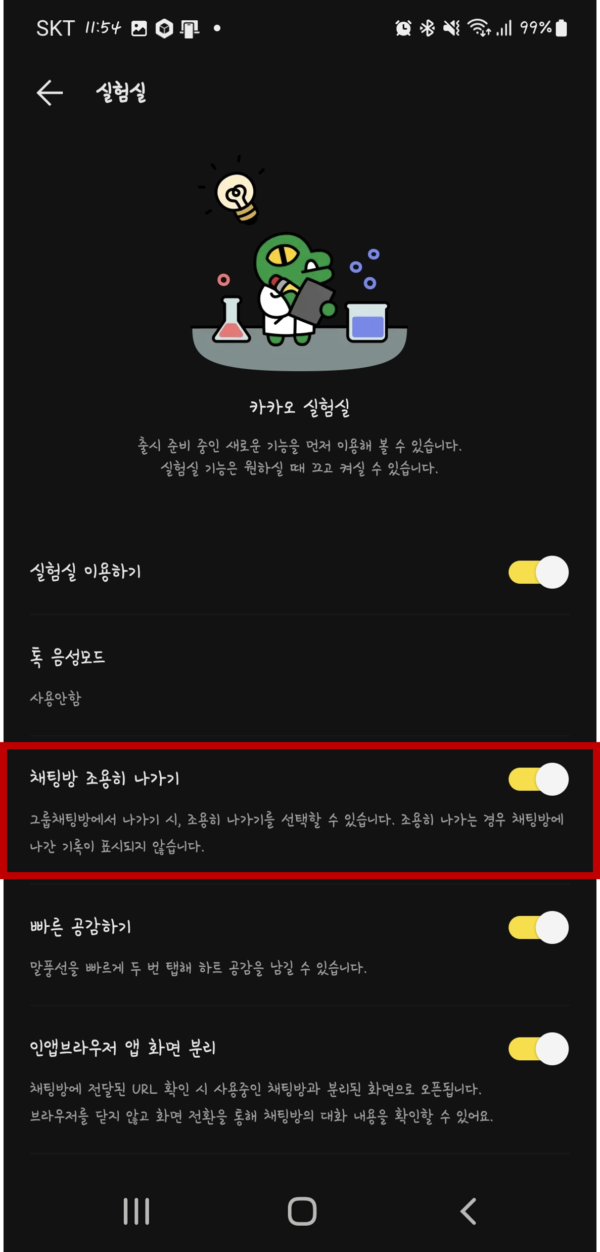 "채팅방 조용히 나가기" 옵션을 찾고 활성화합니다.