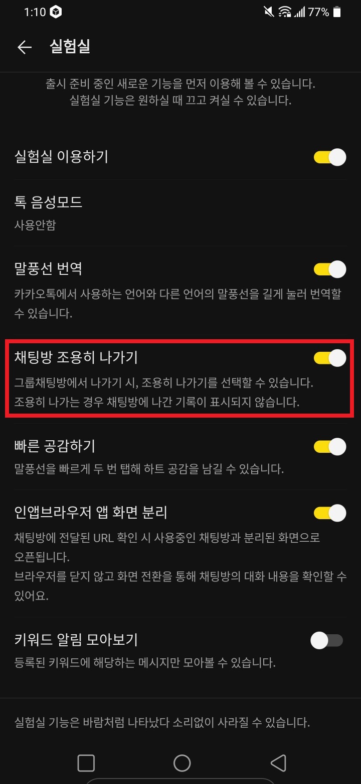 채팅방 조용히 나가기 기능을 사용하려면 몇 가지 설정을 해야 합니다. 아래는 설정 방법입니다.